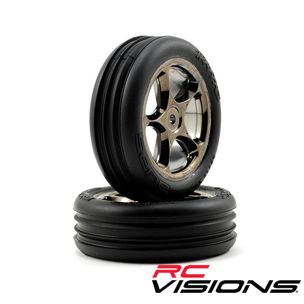 This is a pack of two Traxxas Alias Front Tires, mounted on Tracer 2.2" Wheels. These are the stock tire included with the Traxxas Bandit and feature a classic rib tread pattern. Choose from a Black Chrome or Chrome finish.