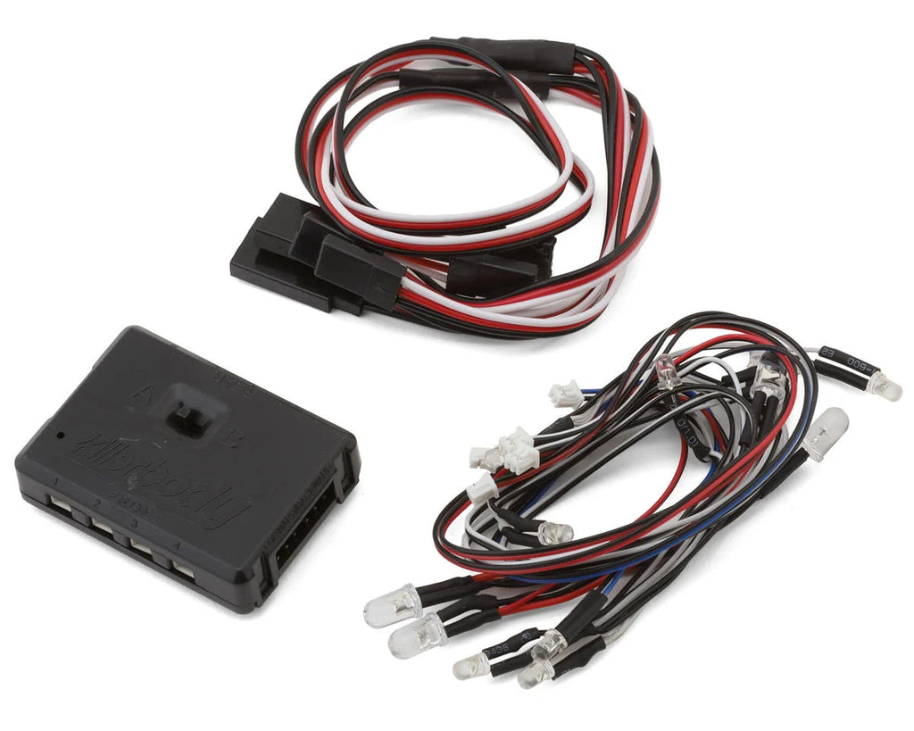 Killerbody Denso Kobelco Sard RC F LED Light Kit with Control Box. This optional LED lights kit is intended to increase scale realism and add a custom look to your 1/10 Denso Kobelco Sard RC F body (KLR-48767 & KLR-48767 - sold separately). The included light controller allows you to control the headlights, brake lights, turn signals and exhaust lighting functions for the ultimate scale realism! Package includes nine 3mm LED lights, four 5mm LED lights, one light controller, one instruction manual and a JST (Futaba) plug extension harness.