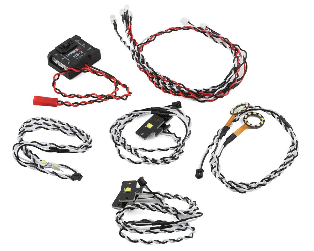 MyTrickRC Axial SCX10 III (AXI03003T1/AXI03007) LED Light Kit with HB-2 Controller. This optional LED light kit is equipped with a long list of killer features like the dual light headlights with bright white halos on the outside with separate center LED, Interior lights for added scale realism, 3D printed parts for Headlights, tail lights, light bar and interior Lights and an inline quick disconnect, so you can easily separate the body from the chassis! Get this easy to install with plug and play design LED light kit for night crawling sessions and take your SCX III scale realism to the next level!