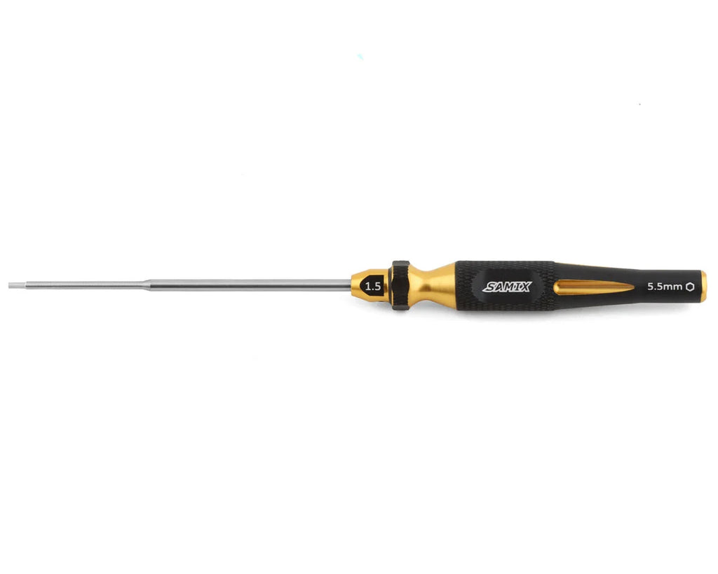 This is the Samix FCX24 2-in-1 Hex Wrench/Nut Driver. This two in one tool gives you the two most common hex and nut driver needed to work on the FCX24 rock crawler. The driver features a high quality tip attached to a CNC aluminum handle with black and gold anodizing. This is an excellent addition to your toolbox and gives you a convenient option for working on your FCX24.