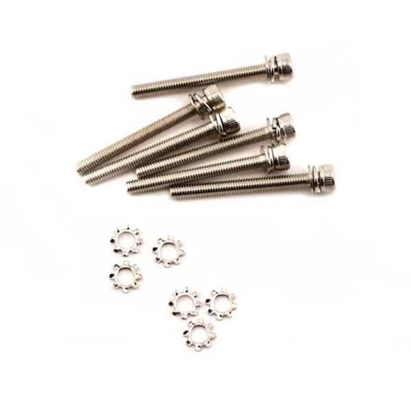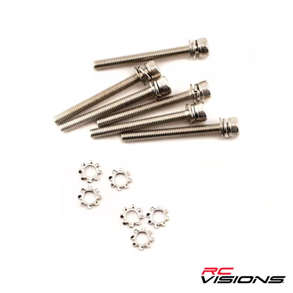 This is a pack of six 3x28mm cap head machine screws and lock washers from Traxxas. These are the long silver screws used for the engine mount on Traxxas vehicles, including the Traxxas Revo.