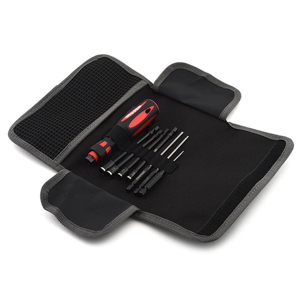 The included rubber over-molded handle holds the bits securely with a powerful magnet for fast bit changes. Headed to the track? Don’t worry, the included heavy-duty tool pouch keeps everything secure for traveling.